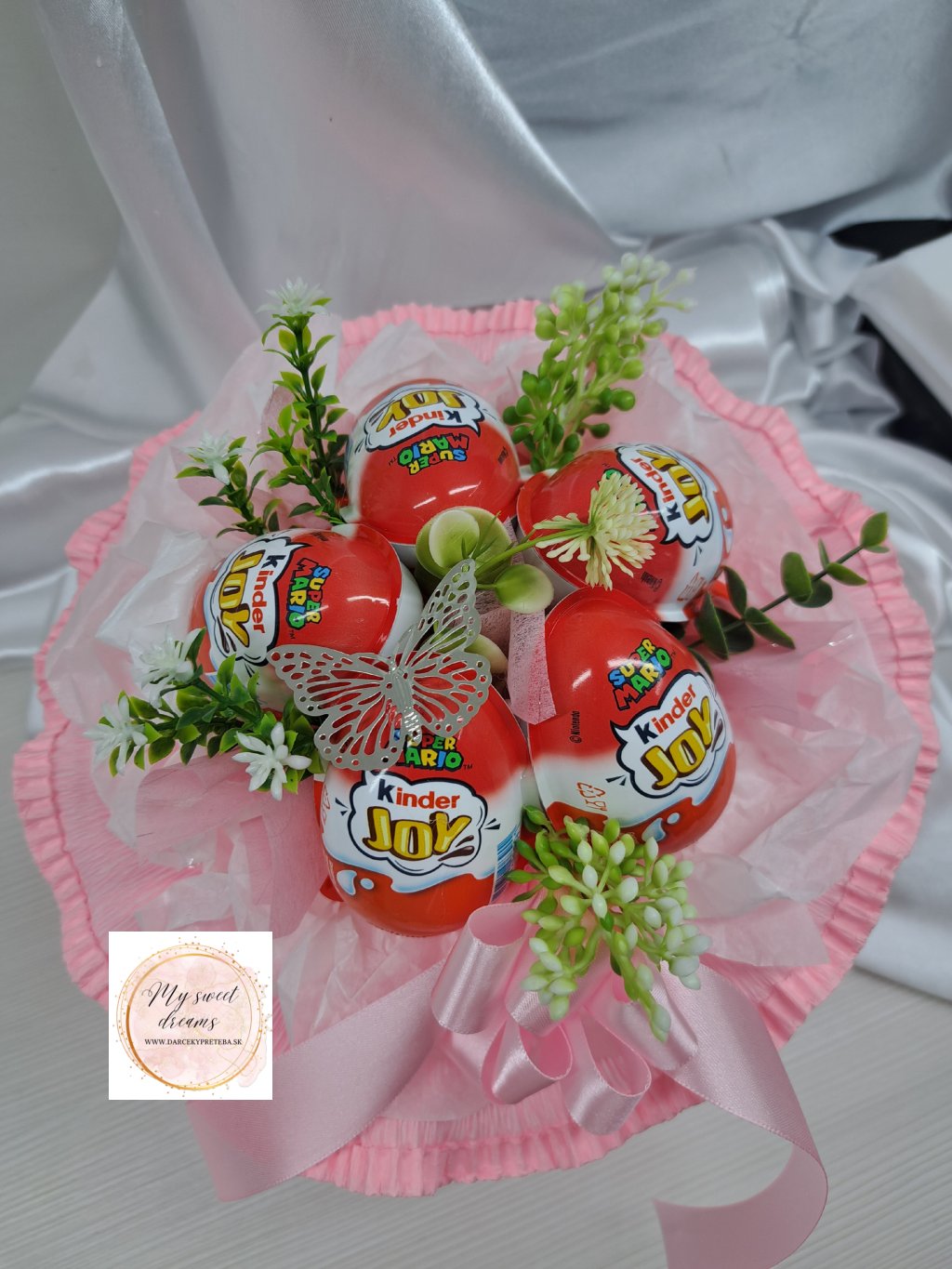 Kytica z kinder joy obsahuje 5 ks kinder joy a je naaranžovaná pomocou umelej zelene do gratulečnej kytice ktorá je vhodná na každú príležitosť pre dámsku aj pánsku populáciu .Farebne vám ju radi upravíme podla vašich predstáv stačí len napísať do kolonky poznámka vaše prianie a my vám ju nachystáme podla vašich predstáv.