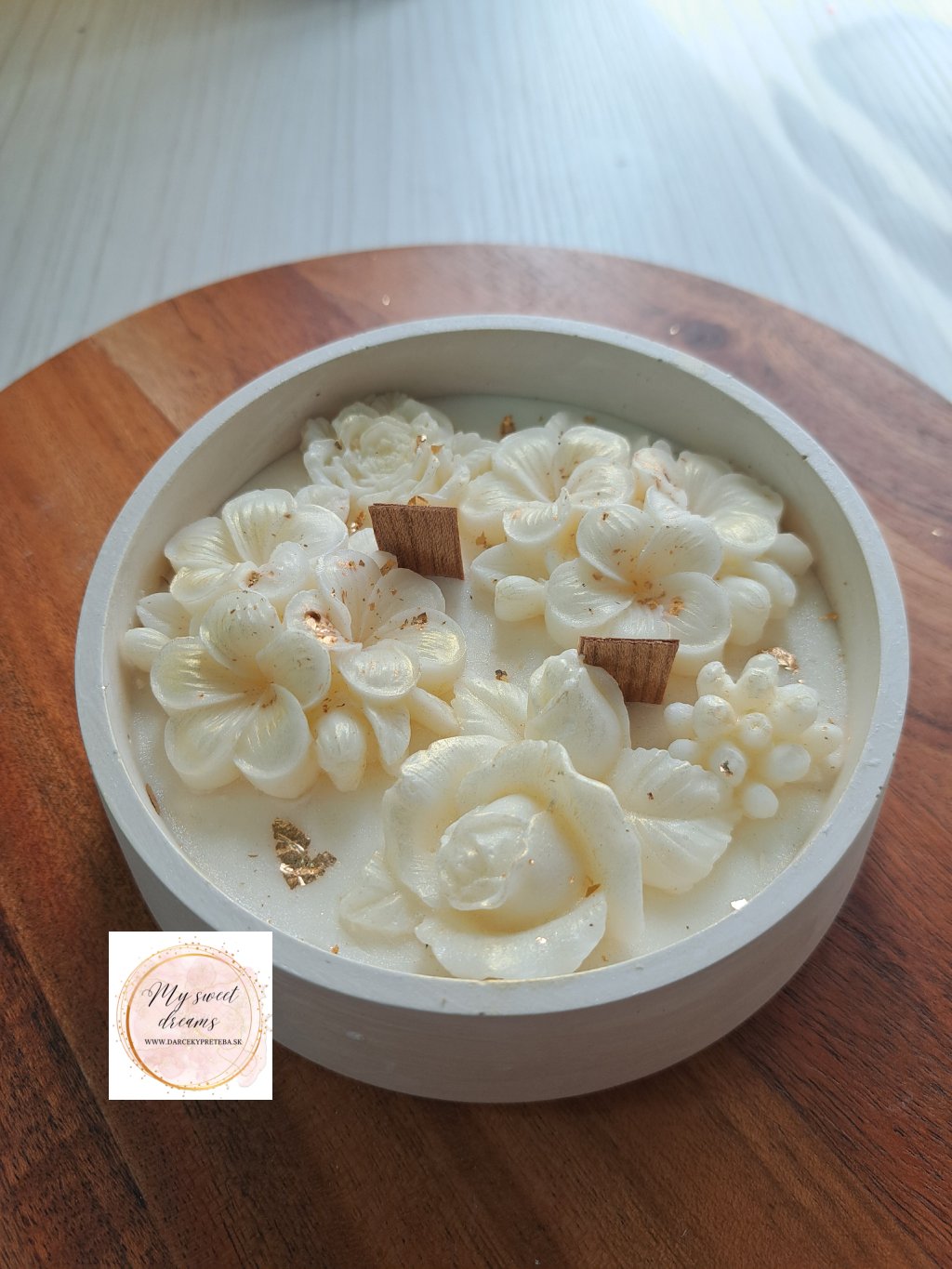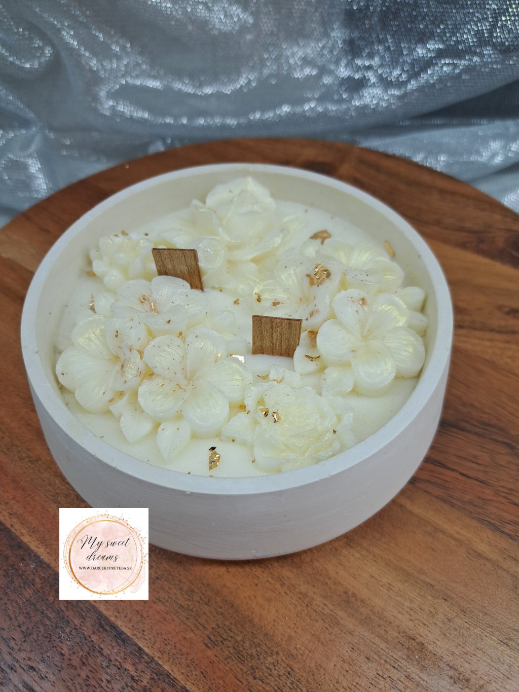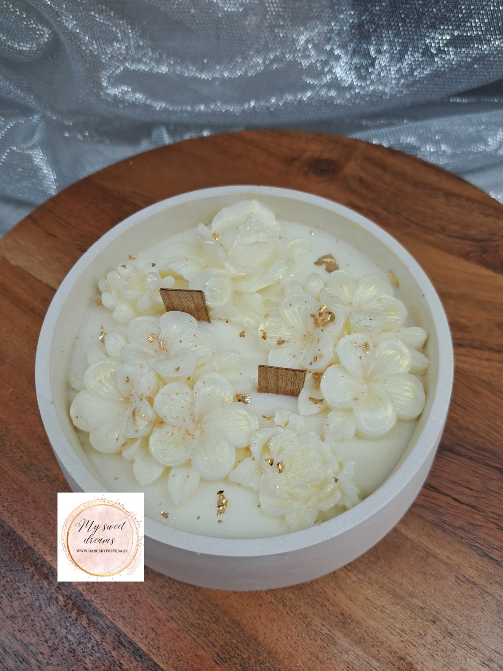 Elegantná - Sójová sviečka s príjemnou vôňou ozdobená kvetinkami zo sójového vosku vám po zapálení ponúka atmosféru pokoja pri dlhých večeroch. Je vhodná ako darček pre každú príležitosť.