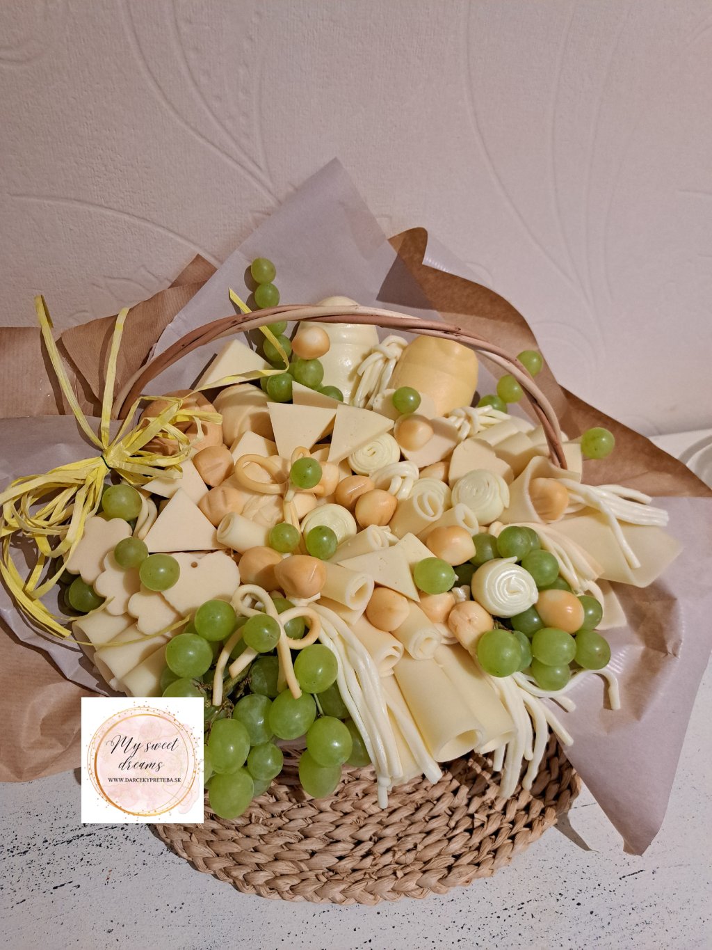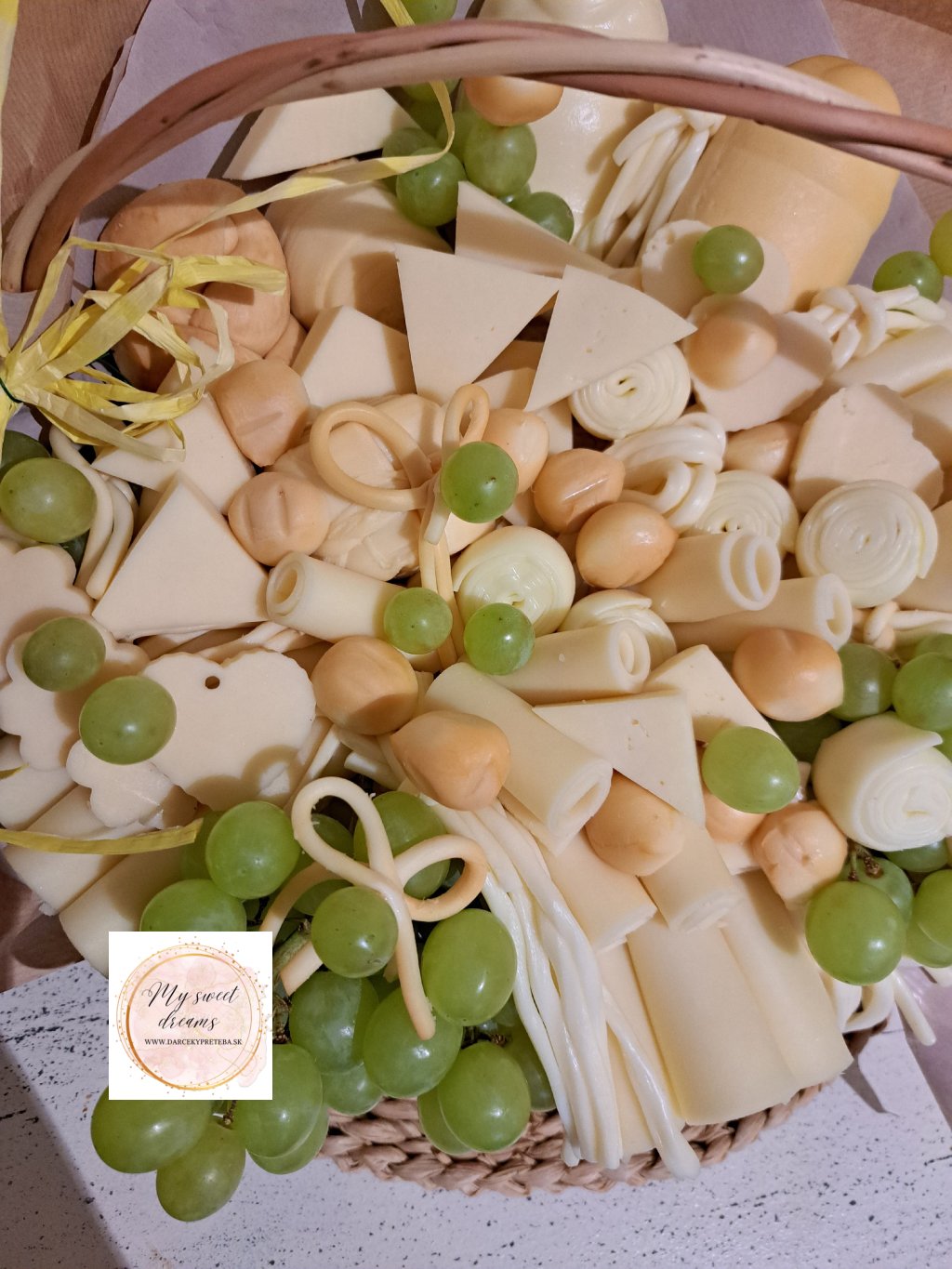 Košík plný syrových dobrôt. Obsahuje klasické aj údené syry . Priemer košíku je 35 cm. Každý košík je individuálny keďže je to ručná práca môže sa rozloženie jednotlivých produktov líšiť od obrázku. Ak máte iné prianie stačí ak nám dáte vedieť a my vám ho vyrobíme podľa vášho priania.